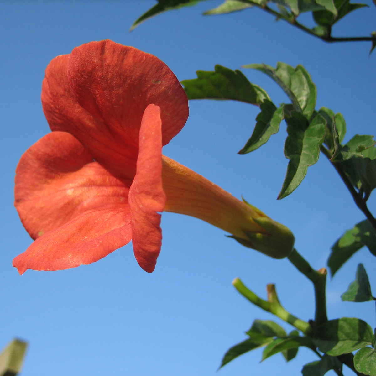 orangeröda 7-8cm stora blo. i klasar, doft, juli-sept, 4-8m, 20-30cm stora blad, sol, zon 1-3, täckas.