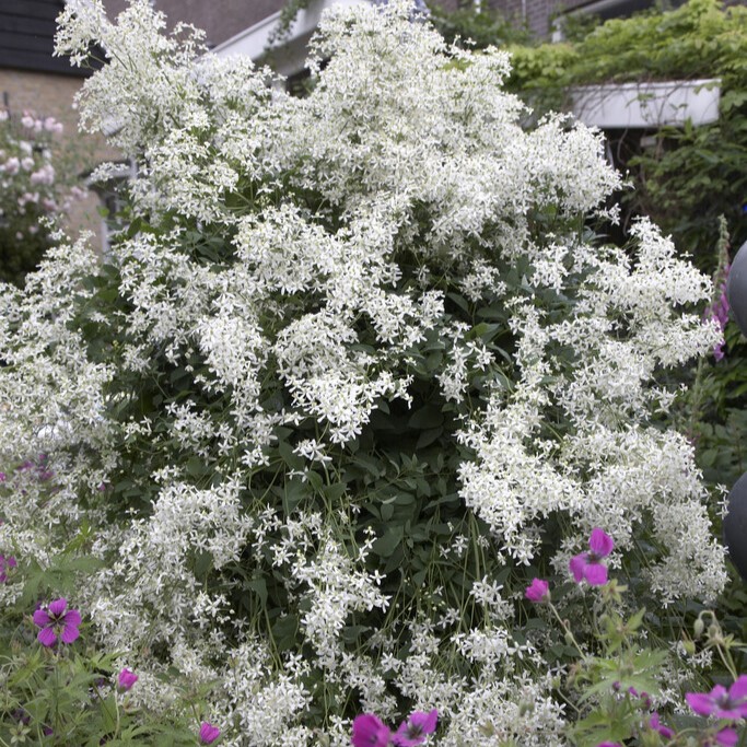 vit, söt doft, små blo, fröställningar, 1-2m, juni-aug, sol, halvskugga, zon 1-6.