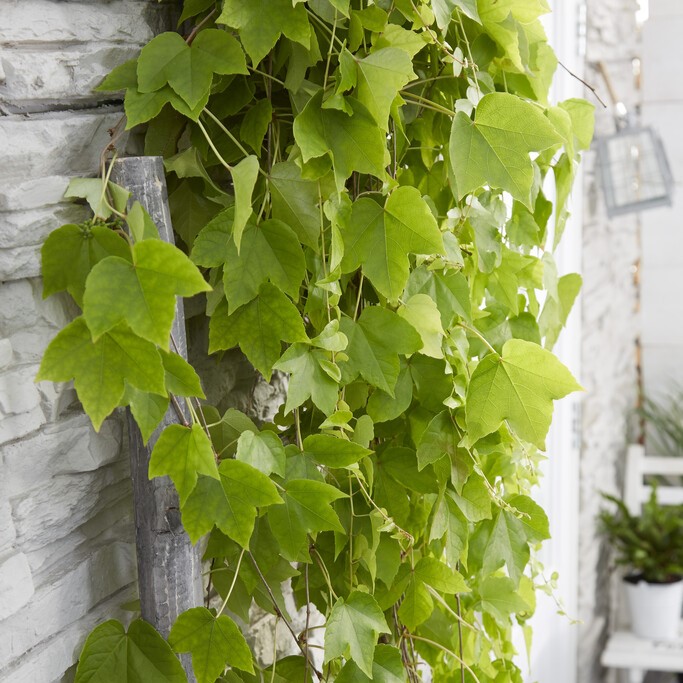 grönvit, maj-juni, små mörkblå bär efter blomning, limegula blad, rödorange höstfärg, treflikiga blad, 6-8m, sol, skugga, zon 1-3, klättrar med sugfötter.