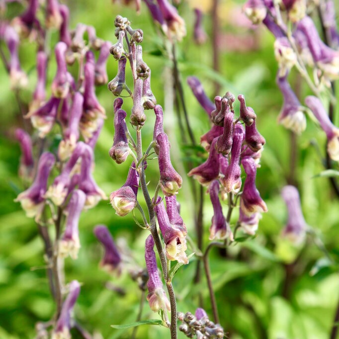 lila, mörk stjälk, maj-juli, 60cm, sol, halvsk, giftig.A