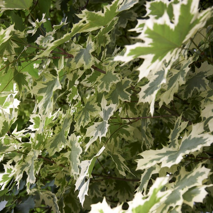 | Acer platanoides 'Drummondii' utmärker sig med sina grönvita, brokiga blad som ger ett starkt ljusspel i kronan. |
