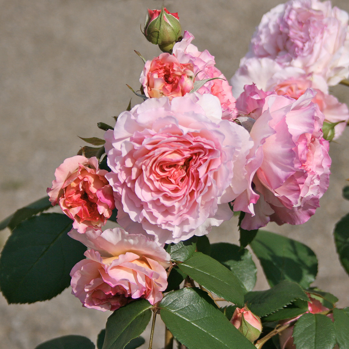 Bladverket är friskt, mörkgrönt och lätt glänsande — en perfekt kontrast till de rosatonade blommorna. Sorten är känd för sin goda sjukdomsresistens och sin tillförlitliga växtkraft, vilket gör den mycket uppskattad i nordiska trädgårdar.