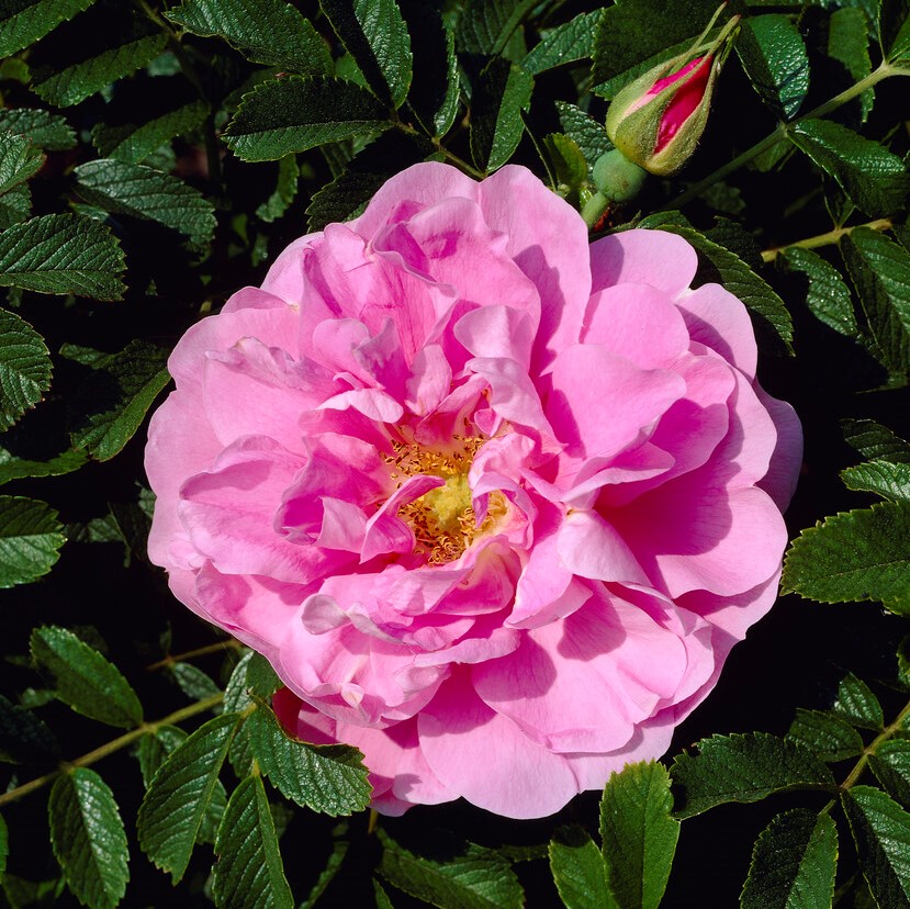 rosa, halvfyllda stora blo., medelstark söt kryddig doft, 1,2-1,5m, juni-okt, sol, skugga, anno 1979, zon 1-7.