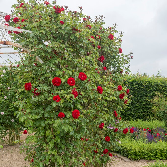 En kraftfull, långblommande och djupröd kordesii-klätterros som ger ett starkt och elegant uttryck genom hela sommaren och hösten.