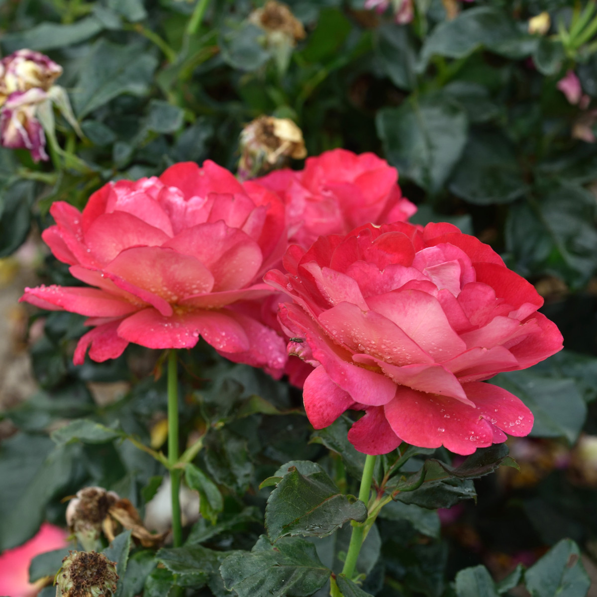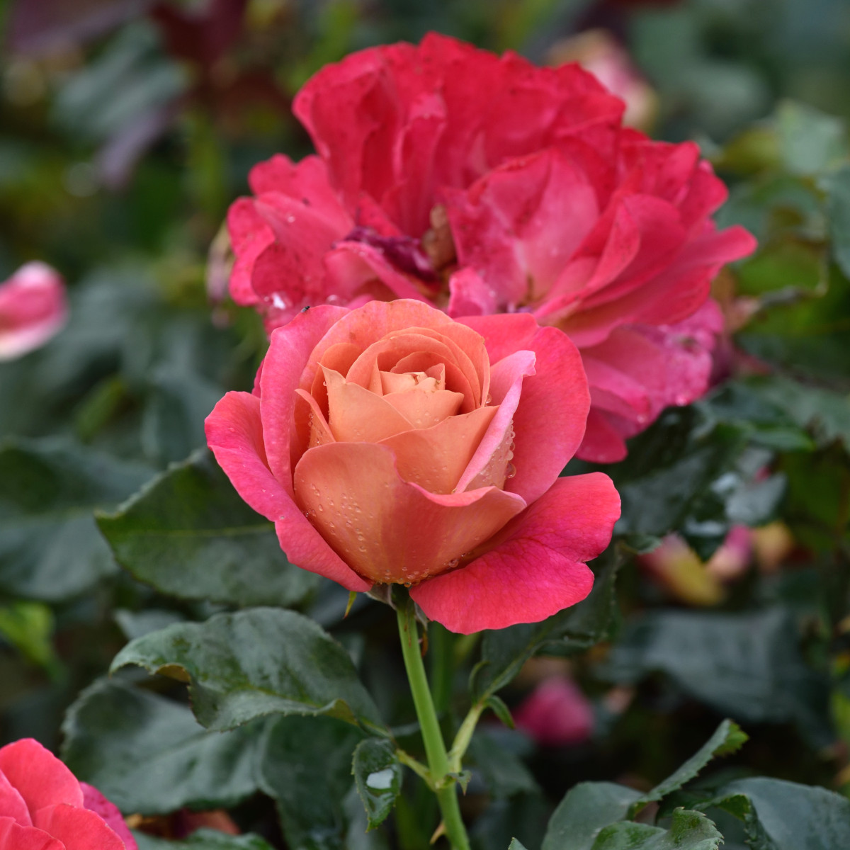 | Korallrosa med kopparbrunt inslag, stora blommor |