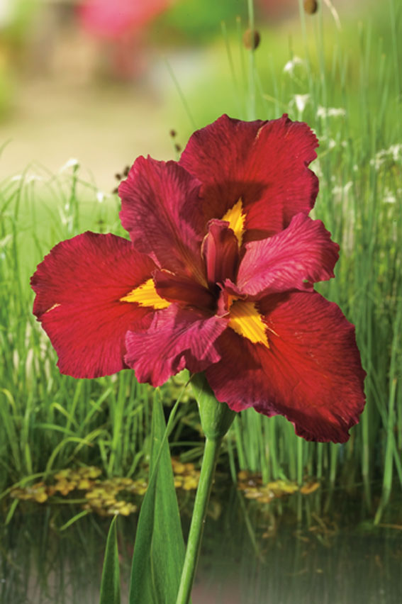 röd/ljusröd, juni-juli, 60cm, vattendjup 0-10cm, sol, halvsk, tas in.